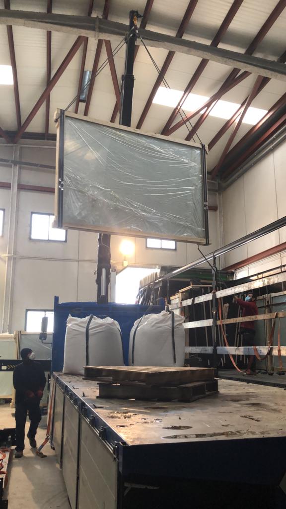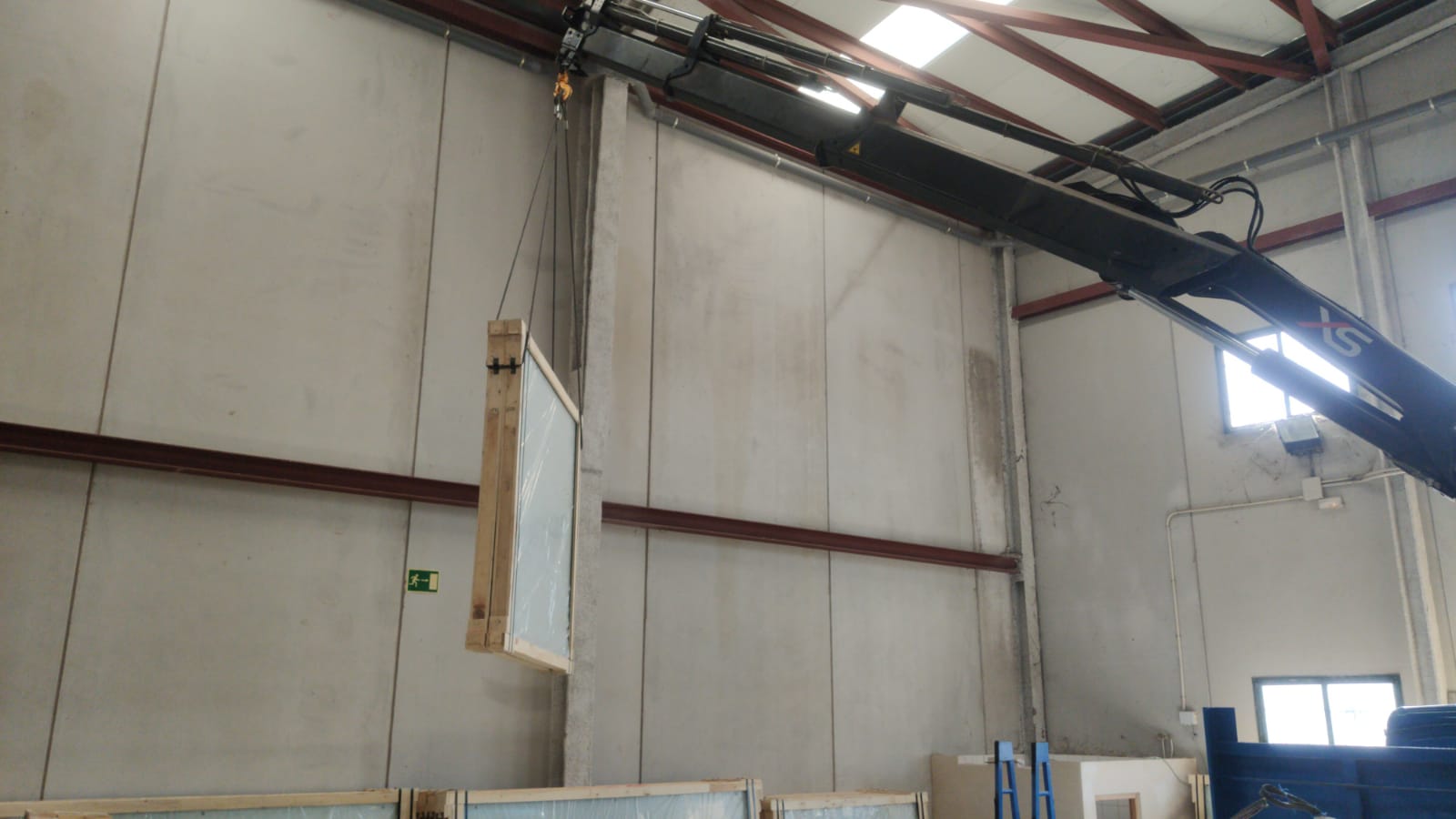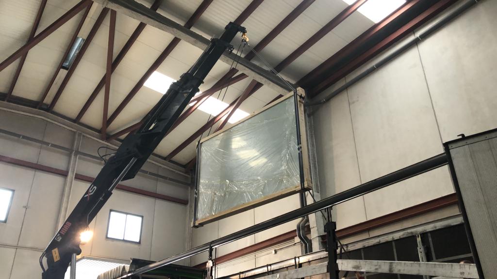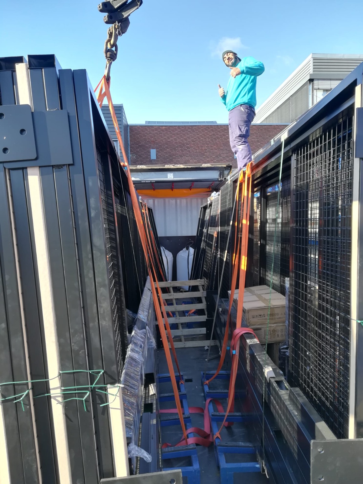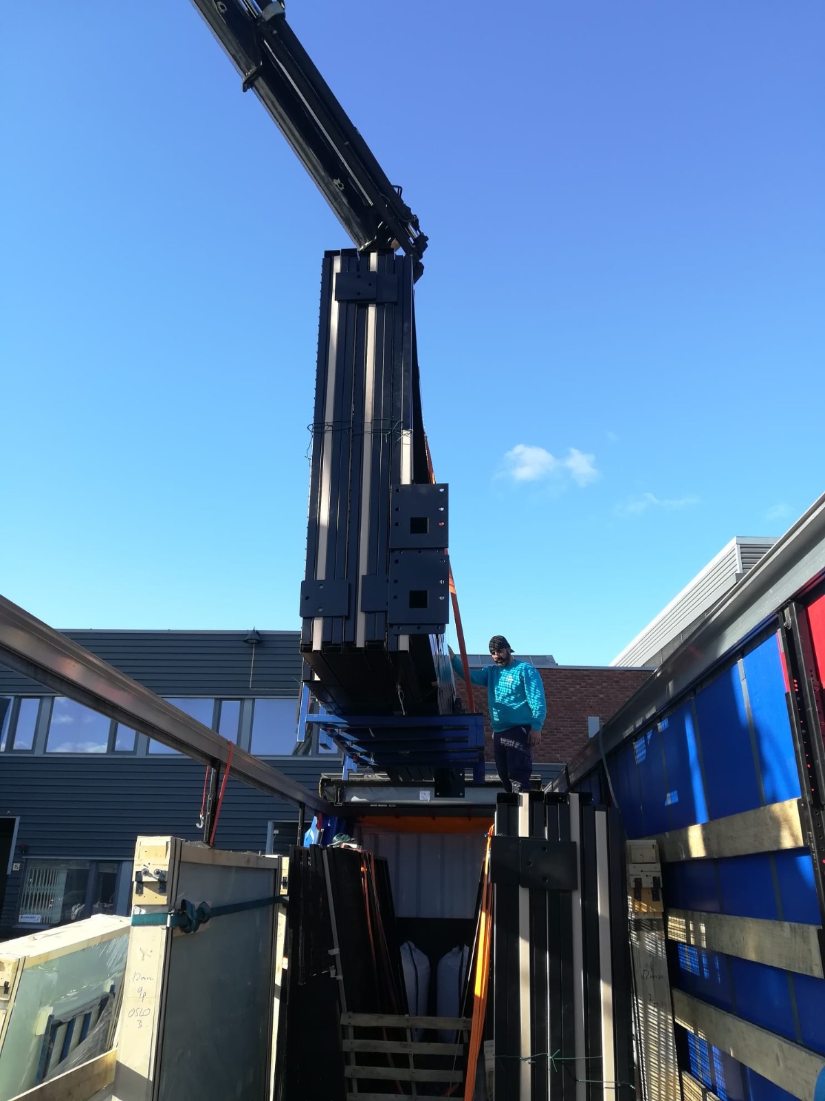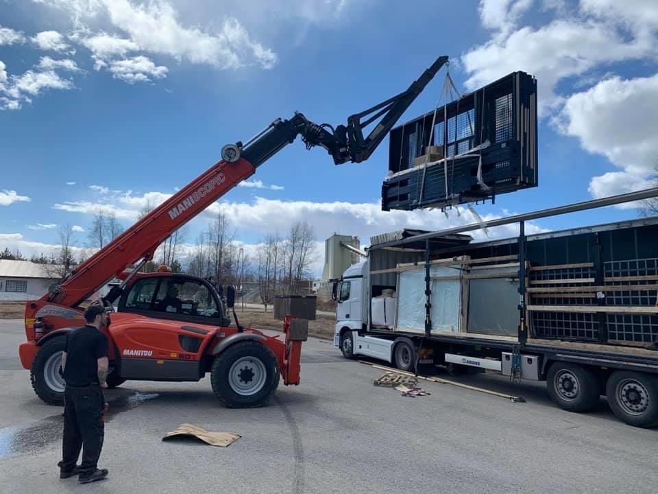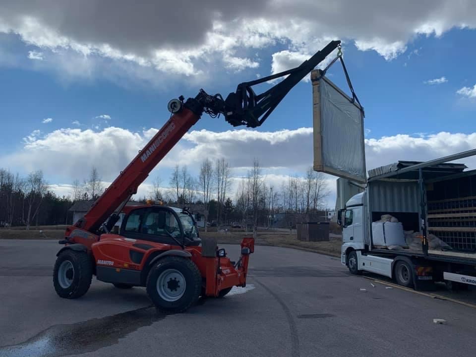 To unload the items from the truck, a crane is needed. If you are going to have outdoor tracks, the most common/best thing is to lift the material and place it on the track directly (the truck is as close to the tracks as possible). If you have indoor tracks and no possibility of driving the truck into the premises and lifting it off there, you must unload the material as close to the entrance as possible and from there take it in with the help of a forklift/wheel loader.