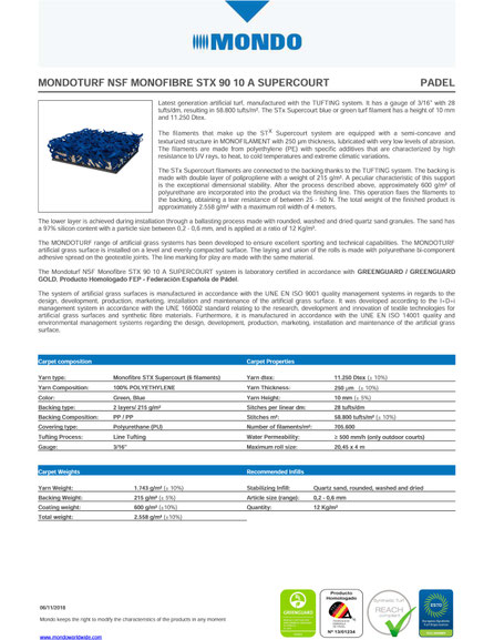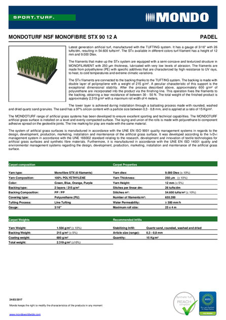 Den spanska tillverkaren samarbetar med Mondo, som är att anses som ledande inom underlag för padelbanor och har bla MondoTurf STX Supercourt som används på World Padel Tour. Underlaget går att få i olika färger (vissa färger mot tillägg). Vilket underlag som passar just ditt projekt är något som vi gärna hjälper dig komma fram till. Det finns ett antal variabler att ta hänsyn till såsom slitage, underhåll etc.
